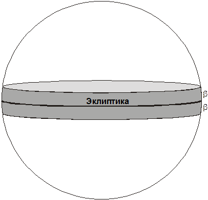 Как известно, лунная орбита прецессирует вокруг полюса эклиптики с периодом 18.6 лет, вращается и ее линия апсид. Поэтому за определенный период времени может произойти покрытие Луной любой звезды, находящейся к эклиптике ближе, чем на угол b. Иными словами, звезды, покрываемые Луной, занимают на небесной сфере пояс вокруг линии эклиптики толщиной в 2b (см. рисунок).