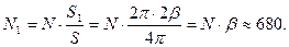 Радиус небесной сферы здесь принят за единицу. Из всех звезд небесной сферы, видимых невооруженным глазом (их число N) в данный пояс попадает часть, соответствующая доле площади небесной сферы S, попадающей в пояс. Число звезд, у которых мы можем наблюдать покрытия Луной, равно
