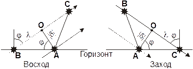 Обозначим через O точку небесного экватора, имеющую то же прямое восхождение, что и звезда A. Тогда точка O и звезда A лежат на одном круге склонения. Соединяющий их отрезок OA перпендикулярен проекции небесного экватора на картинную плоскость, содержащей саму точку O и звезды B и С. Длина отрезка OA равна модулю склонения звезды A, |d|. Из рисунка видно, что при восходе и заходе этот отрезок образует с горизонтом угол, равный широте места наблюдения j. Получаем: