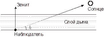 3. Решение. Звездная величина Солнца при отсутствии атмосферного поглощения составляет –26.8m, а звездная величина полной Луны в тех же условиях составляет –12.7m. Вблизи зенита атмосферное поглощение делает Луну слабее на 0.2m, то есть ее блеск становится равным –12.5m. Такой же блеск оказался у Солнца на высоте h (20°) над горизонтом в задымленной атмосфере. Величина поглощения солнечного излучения составила