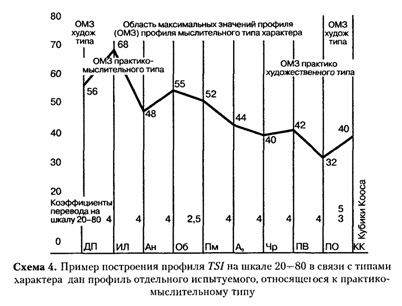 Обозначения субтестов. На схеме 4 даны примерные очертания сфер (областей) максимальных значений возможных профилей каждого из четырех типов характера Эти области определены нами на основании опыта применения методики TSI в системе конструктивной типологии личности для лиц различного возраста. Примечательно то, что возраст до 35–40 лет практически не имеет какого-либо определенного значения в смысле продуктивности в результатах TSI, а поэтому данная методика может служить также для диагностики характерологических особенностей человека, а не только интеллектуальных С другой стороны, связь тех и других существенна для способностей человека.
