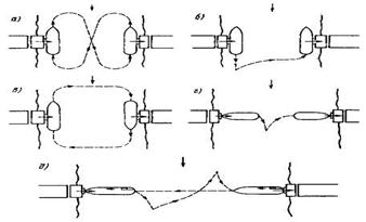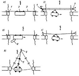 2.2. Возможно применение различных схем организации паромных переправ. На канатных переправах (рис. 2) движение парома осуществляется по тросу, натянутому поперек реки. Перемещение парома по тросу может осуществляться вручную (рис. 2, а), с помощью лебедок при фиксированном прикреплении парома к тросу (рис. 2, б), буксировкой катером под бортом (рис. 2, в), с использованием силы течения реки (паром-самолет) (рис. 2, г). Возможно применение парома-самолета при продольном расположении троса (рис. 2, д), низовой конец которого закреплен на пароме, а верховой - на якоре на расстоянии 1,5-2 ширины реки вверх по течению. На бесканатных переправах используются самоходные или несамоходные буксируемые (толкаемые) паромы. Схемы движения самоходных и несамоходных буксируемых паромов зависят от способа погрузки-выгрузки автомобилей (рис. 3, 4) и местных условий.