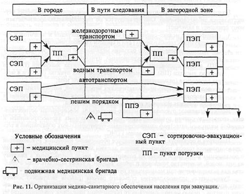 На период проведения эвакуационных мероприятий на СЭП, ПЭП, ПП и ПВ, на маршрутах эвакуации развертываются медицинские пункты с круглосуточным дежурством на них медицинских работников. Медицинские пункты развертывают лечебно-профилактические учреждения по заданию соответствующих органов управления по делам ГОЧС (рис. 11).