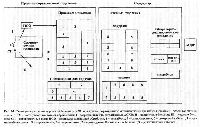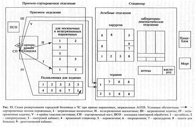 В соответствии с заданием и складывающейся обстановкой больница может развертываться по нескольким вариантам: для приема пораженных с механической травмой, для приема пораженных с механической травмой и ожогами (рис. 14), для приема пораженных АОХВ (рис. 15) и др.