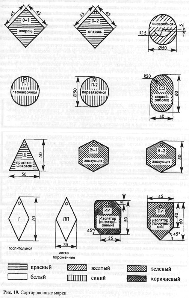 Результаты медицинской сортировки фиксируются с помощью сортировочных марок, а также записи в первичной медицинской карточке пораженного, истории болезни. Сортировочные марки приведены на рис. 19.