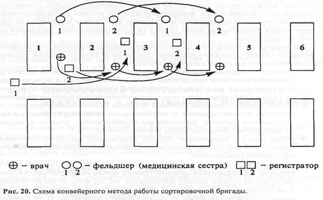 При интенсивном поступлении пораженных (больных) такая организация работы ПМП позволит четко организовать оказание первой врачебной помощи наиболее нуждающимся в ней.