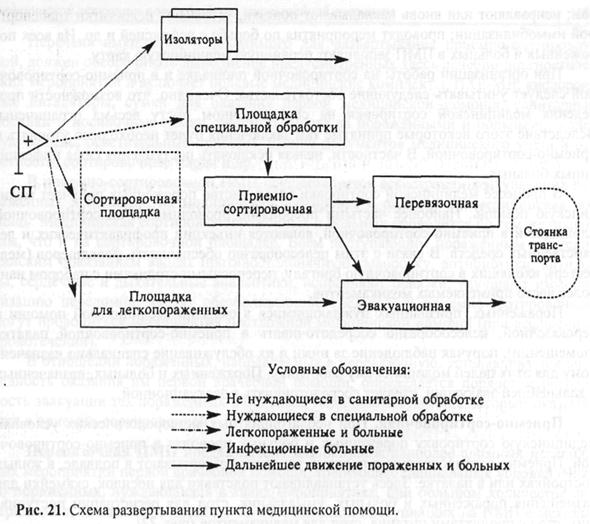 В составе ПМП следует оборудовать сортировочный пост, сортировочную площадку, развернуть приемно-сортировочную, перевязочную, эвакуационную, изолятор, оборудовать площадку для легкопораженных, а при необходимости - и площадку частичной специальной обработки (рис. 21).