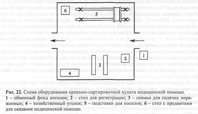 Приемно-сортировочная. При неблагоприятных метеорологических условиях медицинскую сортировку пораженных и больных проводят в приемно-сортировочной. Приемно-сортировочную в полевых условиях развертывают в подвале, в жилых постройках или в палатке. Здесь устанавливают подставки для носилок, скамейки для размещения пораженных и больных, умывальник, стол для регистрации поступивших, стол с продуктами питания, стол для медикаментов (рис. 22).
