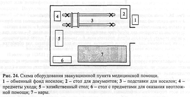 У входа в эвакуационную обычно ставят один-два стола, на которых размещают необходимые лекарственные и профилактические средства, стерильные шприцы и иглы к ним, перевязочный материал, шины и др. При неблагоприятных метеорологических условиях в палатке или помещении оборудуют места для носилочных и ходячих пораженных, ожидающих эвакуации. В летнее время для размещения носилочных и ходячих пораженных, назначенных на эвакуацию, может быть выделена площадка.