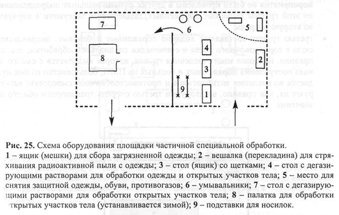 Площадка частичной специальной обработки ПМП предназначается для частичной специальной обработки пораженных и больных, а также дезактивации, дегазации и дезинфекции обмундирования, обуви и снаряжения (рис. 25).