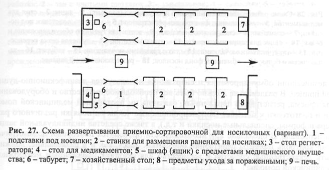 В приемно-сортировочной устанавливают станки и подставки под носилки, предметы типового оборудования (складные скамейки, табуреты, столы унифицированные, стойки, умывальник и др.), отопительные приборы (печи), бачок с питьевой водой и др. (рис. 27).