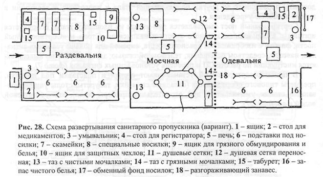 В санитарном пропускнике оборудуются раздевальня, моечная и одевальня (палатки). Для нагрева воды и подачи ее в моечную, а также для камерной дезинфекции и дезинсекции обмундирования и снаряжения используется дезинфекционно-душевой прицеп. В раздевальне должно быть все необходимое имущество и оборудование для приема, регистрации пораженных, оказания им неотложной медицинской помощи и подготовки к помывке (водонепроницаемые чехлы на повязки различного размера и формы, специальные носилки и т.д.). а также средства индивидуальной защиты персонала. В одевальне при необходимости проводится повторный дозиметрический контроль полноты санитарной обработки. Здесь, как и в раздевальне, должны быть лекарственные средства и имущество для оказания пораженным неотложной медицинской помощи.