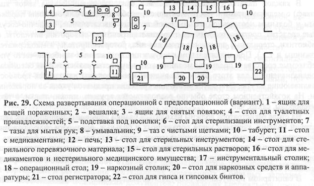 В предоперационной и предперевязочной пораженных готовят к оперативному вмешательству. В перевязочную в основном поступают пораженные с ранениями мягких тканей и обожженные.