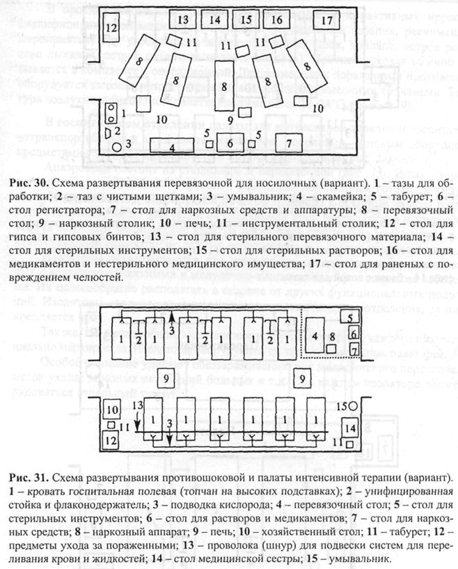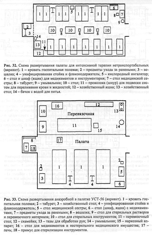 В госпитальном отделении палаты для интенсивной терапии и госпитализации нетранспортабельных оснащаются кроватями, носилками, типовым оборудованием, предметами ухода за пораженными и другим имуществом (рис. 32).