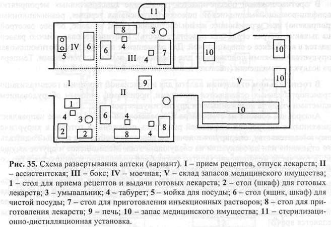 Отделение медицинского снабжения (аптека) этапа обеспечивает истребование, получение, хранение медицинского имущества, его распределение по подразделениям, приготовление для отделений различных лекарственных форм и снабжение их необходимыми препаратами (готовыми лекарствами), перевязочными средствами и медицинскими предметами (рис. 35).