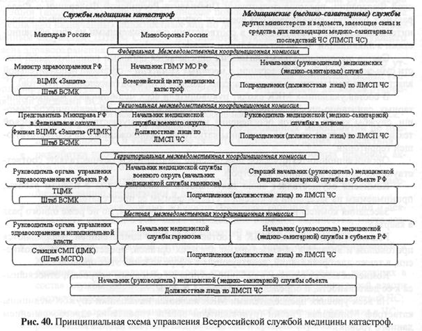 Руководящими органами Службы на федеральном, региональном и территориальном уровнях являются соответствующие межведомственные координационные комиссии, Всероссийский центр медицины катастроф «Защита» Министерства здравоохранения Российской Федерации и его филиалы (региональные центры медицины катастроф), территориальные центры медицины катастроф, которые одновременно выполняют функции штабов Службы. На местном уровне функции штаба Службы возлагаются на центры медицины катастроф (где они создаются) или руководство станций (подстанций) скорой медицинской помощи, а на объектовом уровне - на специально назначенных должностных лиц по делам гражданской обороны и чрезвычайным ситуациям. Штабы Службы подчиняются руководителям соответствующего звена здравоохранения.
