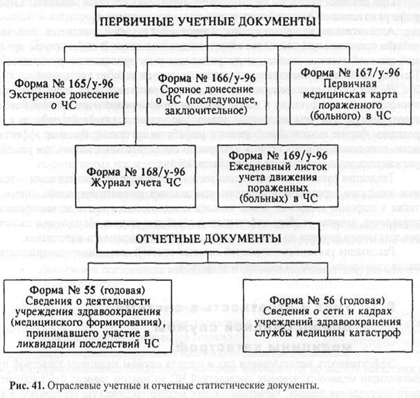 Приказом Министра здравоохранения Российской Федерации от 15.11.2001 № 410 утверждена учетно-отчетная документация ВСМК, которая с 1 января 2002 г. введена в учреждениях здравоохранения (медицинских формированиях), принимающих участие в ликвидации последствий ЧС, а также в центрах медицины катастроф (рис. 41).