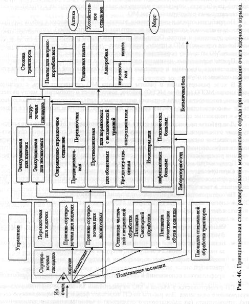 Для работы по ликвидации очага ядерного поражения МО развертывает следующие отделения: сортировочно-эвакуационное, частичной специальной обработки и дезактивации одежды и обуви, операционно-перевязочное, госпитальное с изоляторами для инфекционных больных (на две инфекции) и для пораженных с острыми психическими расстройствами, медицинского снабжения (аптеку), лабораторное, хозяйственное. Предусматривают площадки для стоянки и дезактивации транспорта (рис. 46).