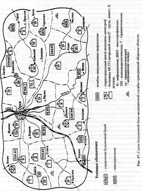 В состав больничной базы входят следующие лечебные учреждения: головные, многопрофильные и профилированные (травматологические, терапевтические, инфекционные, психоневрологические, а при необходимости и наличии возможностей — ожоговые, детские, для легкопораженных) больницы (рис. 47).
