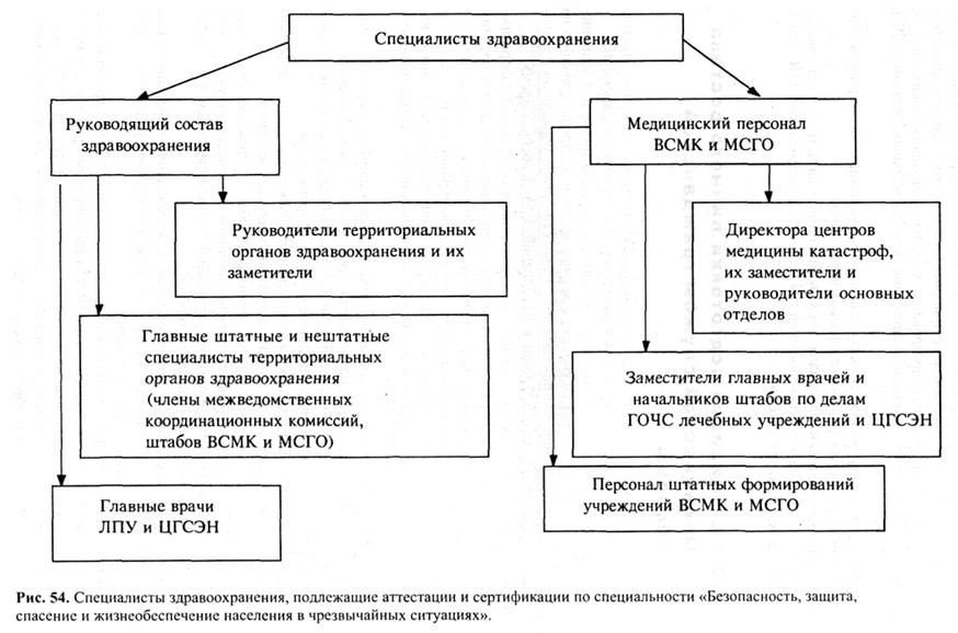 Аттестация проводится в порядке, установленном Правительством Российской Федерации для РСЧС, и обеспечивает проверку профессиональной, физической и психологической готовности персонала к работе в ЧС. Для ее проведения созданы и работают федеральные, региональные и территориальные аттестационные комиссии. Эти комиссии предназначены также и для аттестации специалистов здравоохранения по специальности «Безопасность, защита, спасение и жизнеобеспечение населения в чрезвычайных ситуациях» (рис. 54).