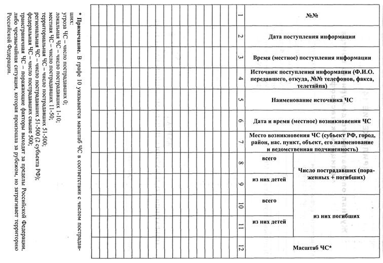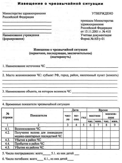 | Число и профиль формирований, участвующих в ликвидации ЧС | Число и профиль дополнительных формирований, необходимых для ликвидации ЧС | Время получения вызова формированием для ликвидации медико-санитарных последствий ЧС | Число пораженных (всего, в том числе детей), состояние пораженных (степень тяжести) и место их госпитализации (населенный пункт, ЛПУ) | Кому передана первичная информация о ЧС | |