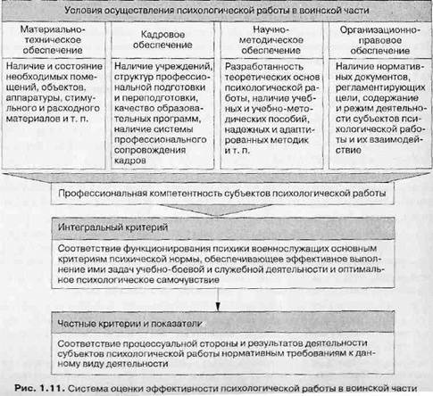 Эффективность психологической работы определяется как степень соответствия результатов данной деятельности намеченным целям и нормативным требованиям. Говоря о целях психологической работы, необходимо отметить, что главным ее функциональным предназначением является оптимизация функционирования труда всех субъектов воинской деятельности, что предопределяет выделение главного (интегрального) критерия. На наш взгляд, таким критерием является соответствие функционирования психики военнослужащих основным показателям психической нормы, обеспечивающее эффективное выполнение ими задач учебно-боевой и служебной деятельности и оптимальное психологическое самочувствие.