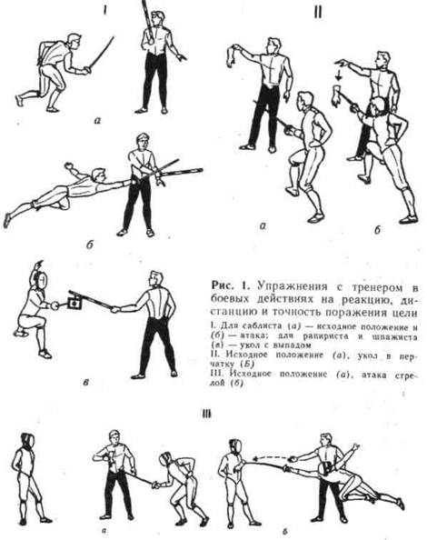 Тренировка с воображаемым партнером. Тренировка с воображаемым партнером, иногда называемая по аналогии с боксом «бой с тенью», состоит из приемов маневрирования с различными наступательными, оборонительными и контратакующими движениями, применяемыми фехтовальщиком в бою с воображаемым противником. Ценность приема — в развитии способности реально представлять себе действия, пути движения клинка противника, «думать за него» и противопоставлять ему свои конкретные, пусть простые, но тактически оправданные приемы. Например, спортсмен, представляя себе маневрирующего противника и передвигаясь в противоположном направлении, должен сохранить «дистанцию»; на один из его воображаемых шагов вперед идти в атаку с обманом удара по маске и одновременно с попыткой воображаемого противника защититься 5-й защитой, выполнять удар по правому боку; продолжать маневрировать и делать вызов-приглашение на удар по маске, защищаясь 5-й защитой и отвечая ударом по правому боку и т.д.