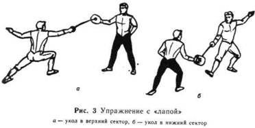 9. Тренер в маске, левая рука в «лапе», правая с оружием (рапира, шпага, сабля). На вызов тренера оружием атакующий ученик делает обман уколом (ударом) с последующим уколом в открывающийся сектор «лапы». На выпрямление вооруженной руки тренера ученик атакует с действием на оружие с последующим уколом (ударом) в «лапу» (рис. 3). Возможны варианты: дистанцию меняет тренер; ученик после неудавшейся атаки атакует повторно; тренер создает попеременно условия для атаки с финтом и действием на оружие.