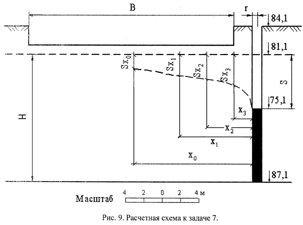 Исходные данные: абсолютная отметка поверхности земли (устье, скважины) 84,1 м; абсолютная отметка статического уровня 81,1 м: абсолютная отметка динамического уровня в скважине при откачке воды 76,1 м; абсолютная отметка водоупора 67,1 м. Коэффициент фильтрации грунта 14 м/сут.