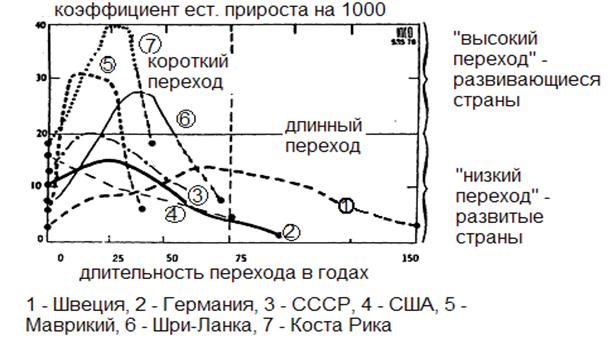 Переход от высоких уровней рождаемости и смертности к низким и получил название демографического перехода. Согласно такой периодизации, экономически развитые страны уже завершили демографический переход, а развивающиеся заканчивают второй и вступают в третий этап, то есть выходят из состояния демографического взрыва и приближаются к завершению демографического перехода.