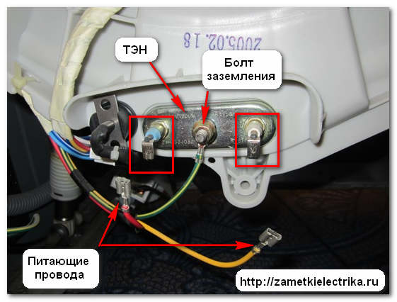 Есть, пожалуй, самый простой вариант проверки ТЭНа — это снять с него два питающих провода (красный и желтый провода для моего примера), за изолировать их и включить машинку в таком состоянии.