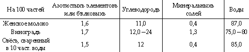 Ещё недавно, до появленія картофеля, который дешевле и легче варится, овёсъ былъ y насъ весьма распространённымъ въ домашнемъ быту. Отъ этой замѣны мы немного выгадали. Теперь намъ извѣстно, что вслѣдствіе слабой питательности картофеля въ мѣстахъ его распространенія стало возрастать употребленіе водки и табака. Нервы, не получая надлежащаго питанія, ищутъ обыкновенно искусственнаго возбужденія. Когда мы не знали о картофелѣ, a ѣли овсяную кашу, овсяный хлѣбъ и лепёшки, народъ былъ здоровѣе и крѣпче, и никакихъ англійскихъ болѣзней не знали. Возвращенiе къ здоровой пищѣ нашихъ отцовъ — овсу было бы громаднымъ прогрессомъ въ питаніи. Когда сравнимъ наши пищевые продукты съ прототипомъ всѣхъ человѣческихъ кушаній — «женскимъ молокомъ», тогда убѣдимся, что два изъ нихъ ближе всего подходятъ къ молоку: одно — виноградъ, a другое — овёсъ. Въ этомъ насъ убѣдитъ слѣдующая таблица: