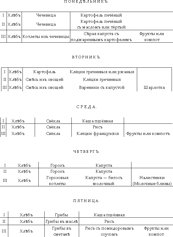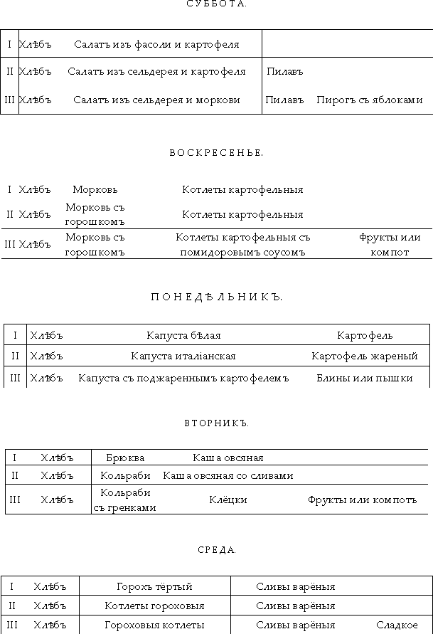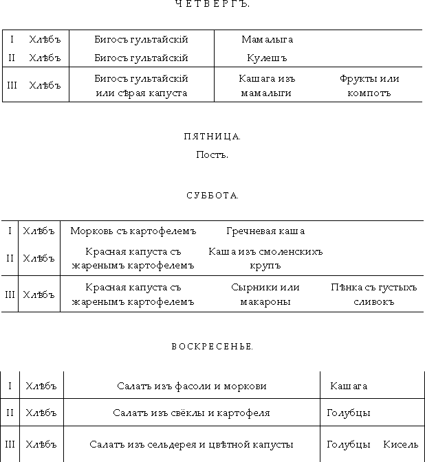 Расписаніе это составлено главнымъ образомъ для зимы. Свѣжіе овощи и зелень сюда не вошли; когда приходитъ ихъ время, они сами напрашиваются въ обѣдъ.