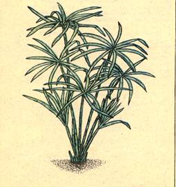 Речь идет о широко известном комнатном растении из семейства осоковых (Сурегасеае) — циперусе очереднолистном (Сурешs alternifolius L), или комнатной осоке. Это растение нередко ошибочно называют папирусом. Циперус и папирус входят в один род, но являются разными видами. Название «циперус» дал шведский ботаник Карл Линней исходя из названий древнегреческого естествоиспытателя Теофраста {I в. до н. э.) и римского врача Диоскорида (I в. н. э.), «кипериос» и «циперос» «в воде растущий», В природе циперус растет по берегам болот и рек на острове Мадагаскар и Маскаренских островах. В 1781 г. он привезен в Европу, где впоследствии стал весьма популярным комнатным и оранжерейным растением.