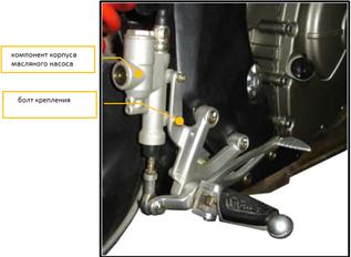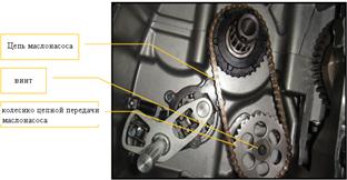 Снимите крышку сцепления, ослабьте винт крепления маслонасоса, снимите колесико цепной передачи маслонасоса и цепь маслонасоса.