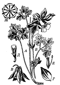 Малюнак 72 – Ворлікі звычайныя (Aquilegia vulgaris): А,Б – квітучая расліна;