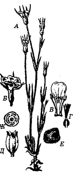 В – кветка; Г – чашалісцік; Д – пялёстак; Е – тычынка і песцікі;