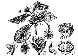 Б – кветка ў падоўжным разрэзе; В – дыяграма кветкі;