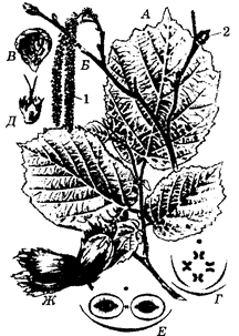 В – нектарнік; Г – тычынка; Д – песцік; Е – спелыя лістоўкі