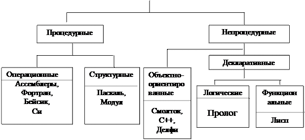 При использовании декларативного языка программист указывает исходные информационные структуры, взаимосвязи между ними и то, какими свойствами должен обладать результат. При этом процедуру его получения («алгоритм») программист не строит (по крайней мере, в идеале). В этих языках отсутствует понятие «оператор» («команда»). Декларативные языки можно подразделить на два семейства - логические (типичный представитель - Пролог) и функциональные (Лисп). По всей видимости, непроцедурные языки имеют большое будущее. Все сказанное выше можно отобразить схемой – крупно-структурной классификацией языков программирования. В ней указаны основные методологии программирования; в нижнем ряду - типичные языки соответствующих групп.