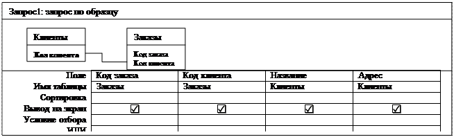 Бланк запроса по образцу состоит из двух областей. В верхней отображается структура таблиц, к которым запрос адресован, а нижняя область разбита на столбцы и строки – по одному столбцу на каждое поле будущей результирующей таблицы. С помощью контекстного меню в верхней части бланка открывают те таблицы, к которым обращен запрос. Затем в них щелкают двойными щелчками на названиях тех полей, которые должны войти в результирующую таблицу. При этом автоматически заполняются столбцы в нижней части бланка. Сформировав структуру запроса, его закрывают, дают ему имя и в дальнейшем запускают двойным щелчком на значке в окне БД. Так создается простейший запрос, называемый запросом на выборку. Он позволяет выбрать данные из полей таблиц, на основе которых запрос сформирован.