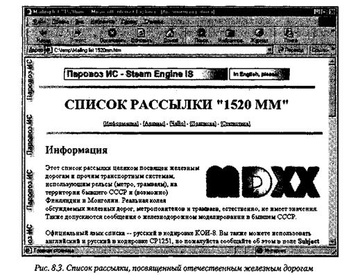 Темами списков рассылки может быть что угодно, например вопросы, связанные с изучением иностранных языков, научно-технические обзоры, презентация новых программных и аппаратных средств вычислительной техники (рис. 8.3). Большинство телекомпаний создают списки рассылки на своих узлах, через которые рассылают клиентам аннотированные обзоры телепрограмм. Списки рассылки позволяют эффективно решать вопросы регулярной доставки данных.