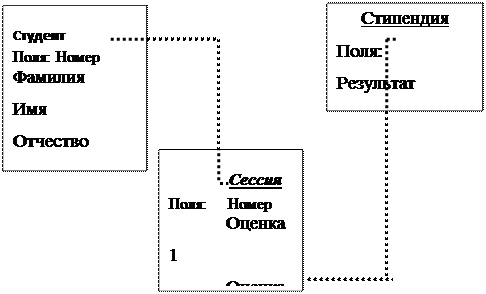 Таблицы Студент и Сессия имеют совпадающие ключи (Номер), что дает возможность легко организовать связь между ними. Таблица Сессия имеет первичный ключ Номер и содержит внешний ключ Результат, который обеспечивает ее связь с таблицей СТИПЕНДИЯ.