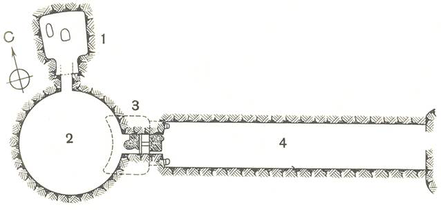перекрытый плитами; 4 – дромос