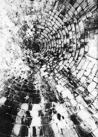 Большая круглая камера диаметром 14,5 м была покрыта куполом высотой 13,2 м. Его кривая начинается от самого пола. Купол выложен концентрическими кольцами с горизонтальными постелями. Купола и своды, сложенные по такой системе, не дают распора и потому называются «ложными». Ложные купола и своды выполняются без кружал, постепенным нависанием одного ряда над другим, одного кольца над нижележащим. Они появились раньше клинчатых; в архитектуре микенской Греции система ложных куполов и сводов достигла большего развития, чем в какой-либо другой архитектуре. Монолиты, перекрывающие вход, громадны, один из них весит более 100 т. При низком уровне строительного производства такие плиты могли быть подняты лишь соединенными усилиями громадного числа людей (рис. 1.34).