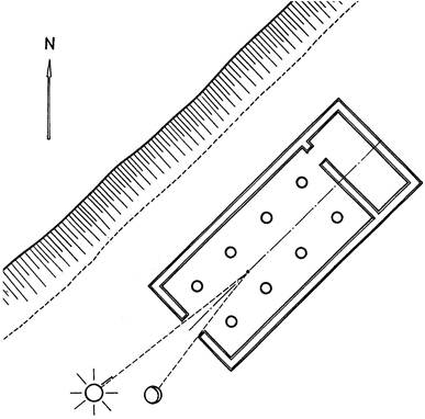Исключением из правил может служить небольшой мегарон в Элевсине (XIII-XII вв. до н.э.), предназначенный для проведения мистерий богини Деметры. Это был двухнефный мегарон с опорами на главной оси, который сыграл особую роль в дальнейшем развитии греческого зодчества. Его место впоследствии занял мистериальный храм Деметры – Телестерион. Древний мегарон был симметричным зданием, приподнятым на несколько ступеней. В нем можно видеть прообраз раннего греческого храма – также мегароноподобного и двухнефного. Этот храм стоял около священного источника Каллихоры и был ориентирован на точку захода Солнца в день зимнего солнцестояния (22 декабря). Храм был невелик, поэтому богослужения здесь проходили во дворе (теменосе) (рис. 1.37).
