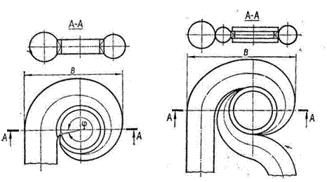 Угол охвата φ спиральной камеры отсчитывают от зуба до входного сечения. Спиральные камеры с неполным углом охвата имеют угол φ < 360°. Ширина спиральной камеры в плане зависит от типа турбины, угла охвата, принятой скорости во входном сечении спиральной части и его формы.