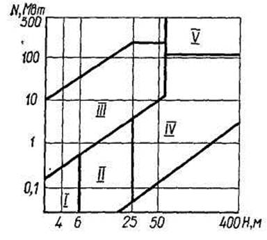 Рисунок 7.3. Области применения турбиных камер: I - открытые, II - кожуховые, III - спиральные бетонные, IV - спиральные металлические, V - с частичной пердачей нагрузки на бетон.