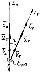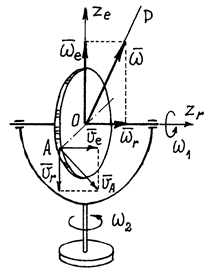 Абсолютным движением будет вращение вокруг точки пересечения осей О. (Еcли тело имеет больший размер, то его точка, совпадающая с О, все время будет неподвижной). Угловые скорости переносного вращения и относительного вращения изображается векторами