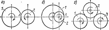 , так как скорость точки сцепления А у обоих колес одинакова. Учитывая, что число z зубцов сцепленных колес пропорционально их радиусам, а вращения колес происходят при внутреннем зацеплении в одну сторону, а при внешнем в разные, получаем